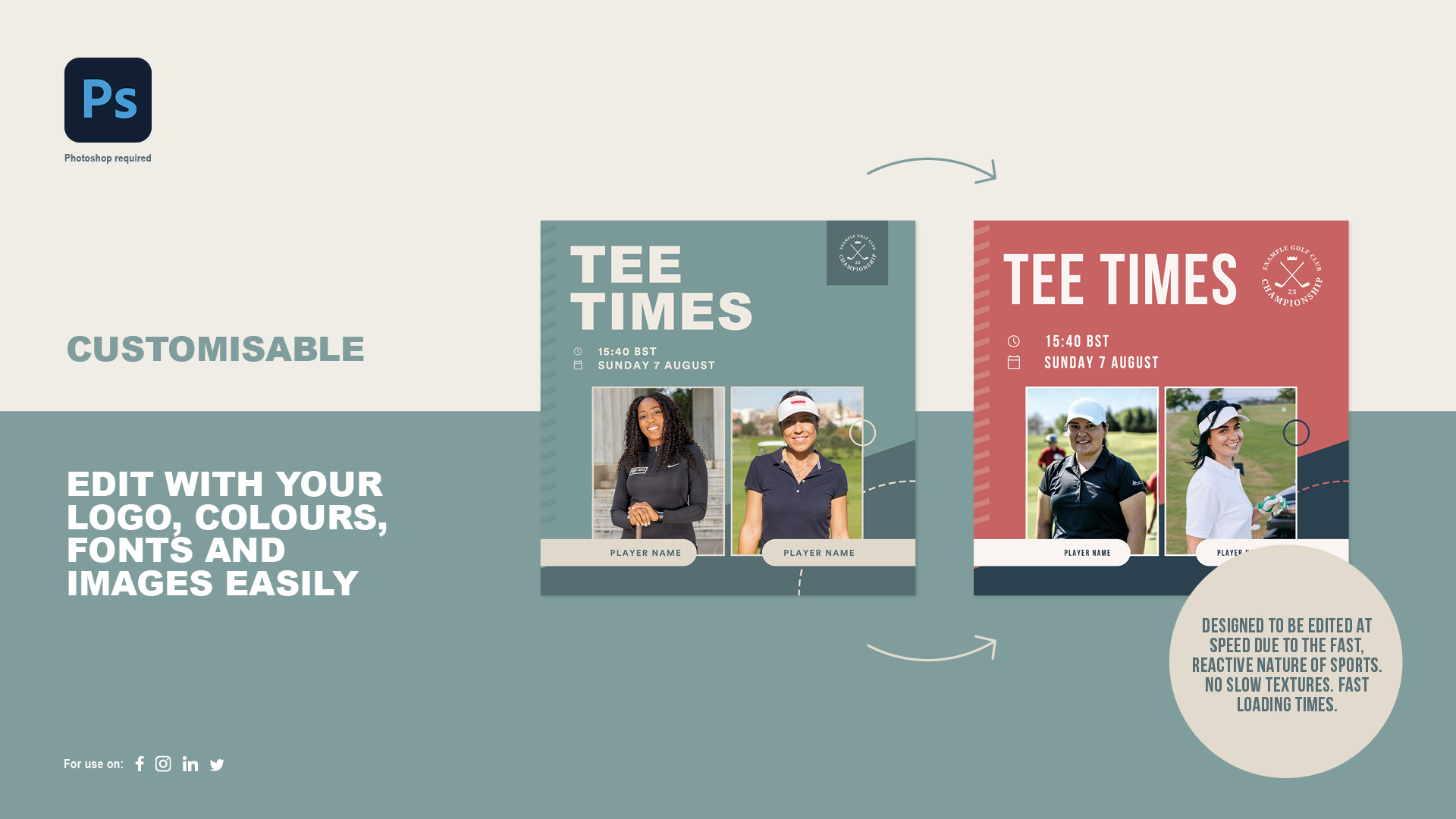 We have designed an easy-to-use collection of social media templates for golf clubs and championships of all sizes. The collection are photoshop files that can be edited with fonts, colours, images and logos to suit your club or organisation.